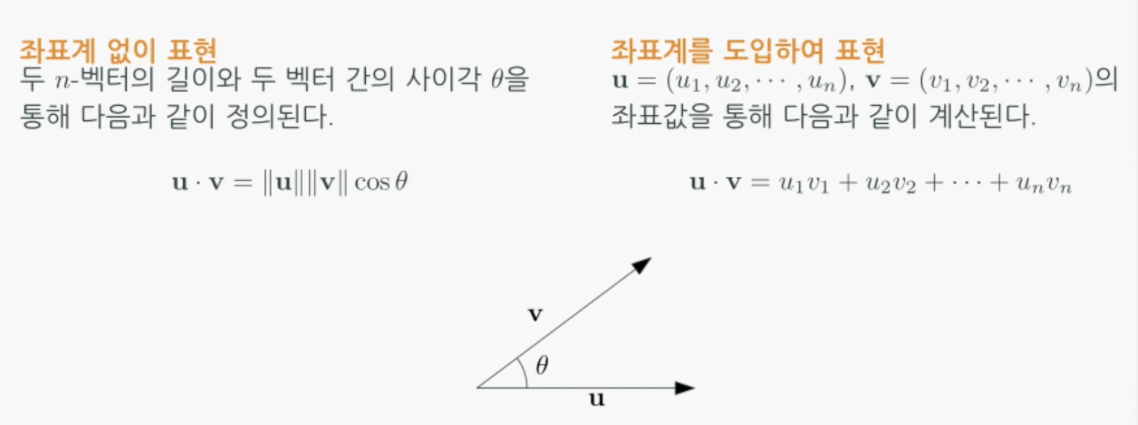 두 벡터 $u$와 $v$에 대한 내적은 다음과 같이 정의됩니다.