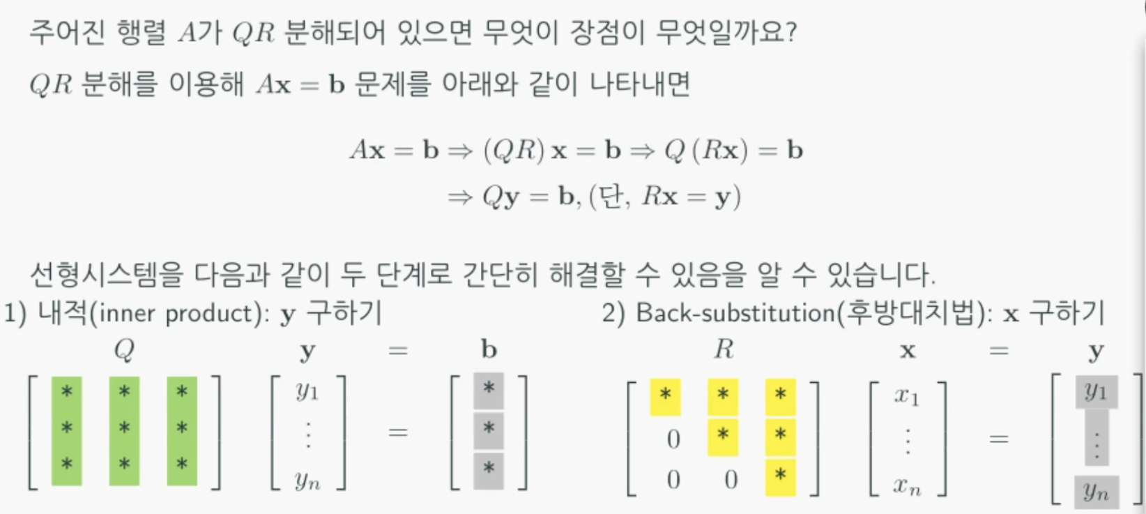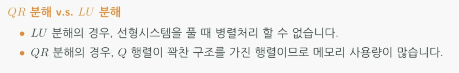 - 빠른 계산: 선형시스템 $Ax = b$의 해를 구할 때, 정규직교행렬 $Q$를 이용한 계산 부분은 병렬처리로 빠르게 계산할 수 있습니다.