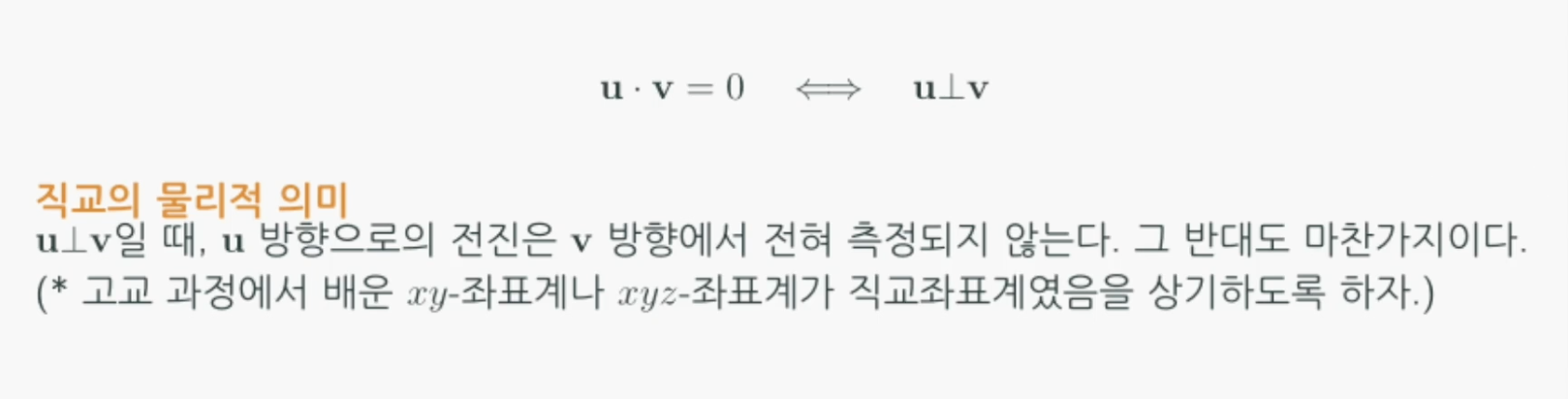 두 벡터 $u$,$v$ 간의 내적이 0이면 두 벡터는 직교(orthogonal)합니다.