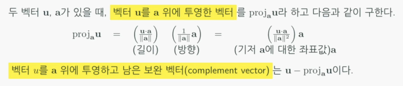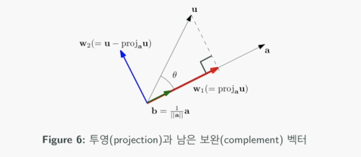 여기서 중요한 점은 투영한 벡터와 보완 벡터는 서로 직교(orthogonal)하다는 것입니다.