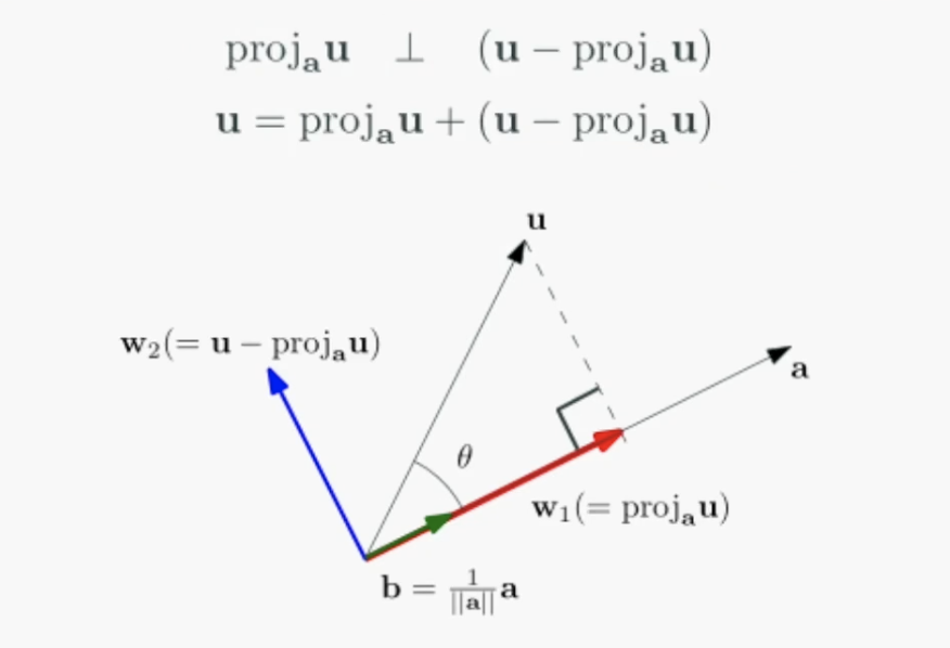 두 벡터 $u$,$a$가 있을 때, 투영과 보완의 개념을 이용해 직교분할을 할 수 있습니다.