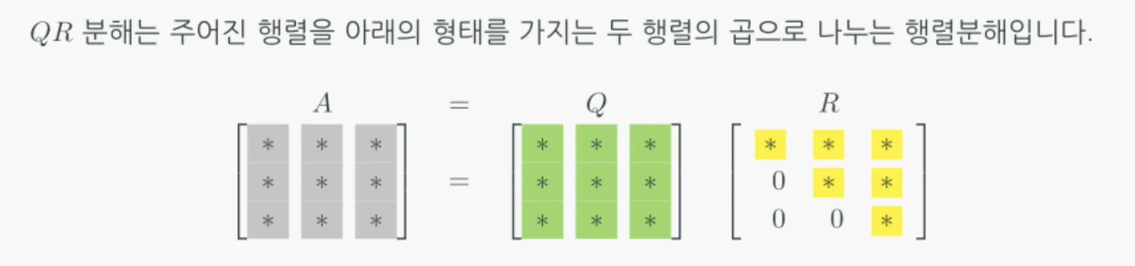- $Q$: orthonomal matrix(정규직교행렬)