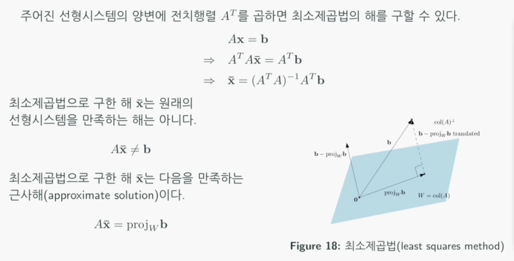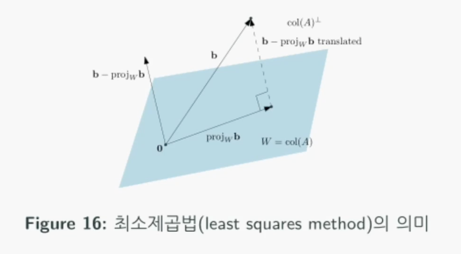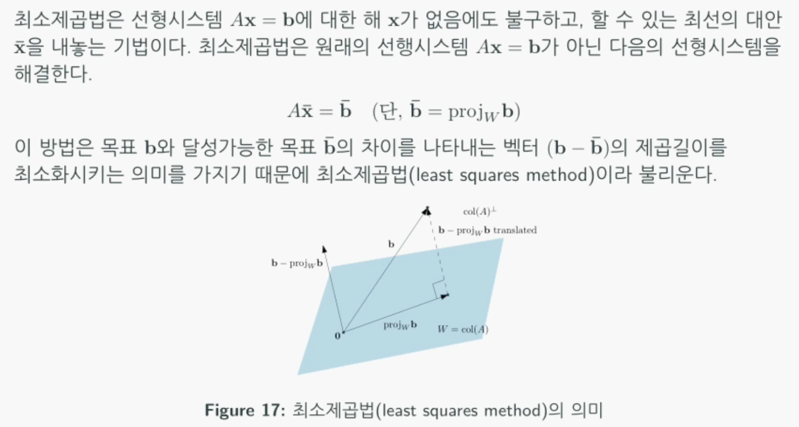 행렬 $A$가 정의하는 열공간에서 목표 $b$와 가장 가까운 지점은 b를 열공간에 투영한 점일 것입니다.