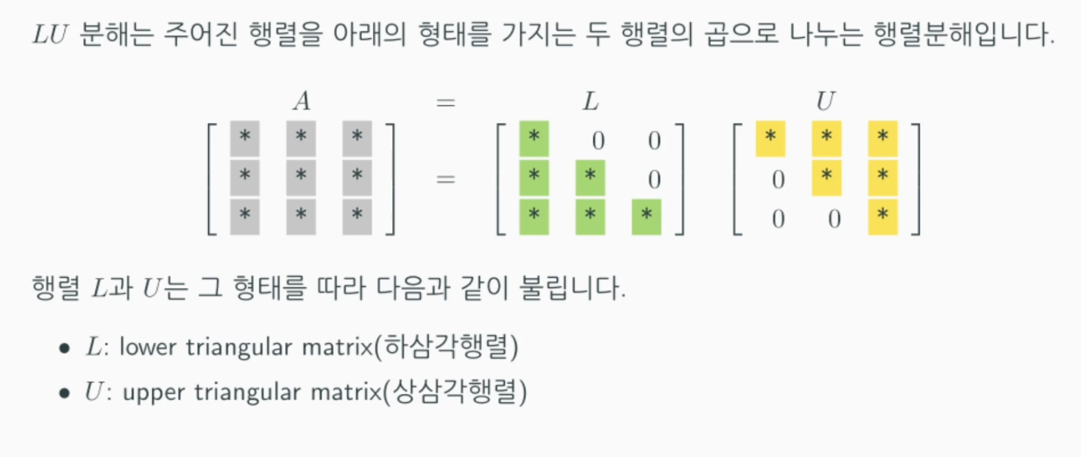 L은 우상단이 모두 0으로 이뤄져 있고 U는 좌하단이 모두 0으로 이뤄져 있는 행렬입니다.
