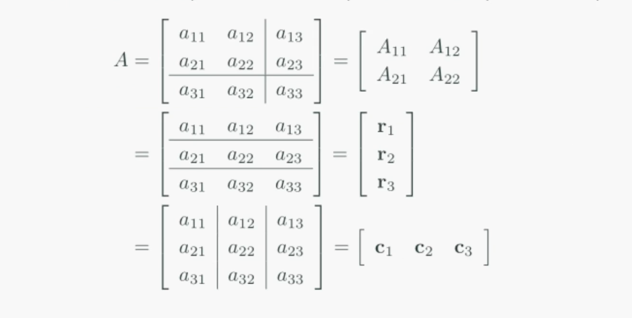 행렬은 부분행렬(submatrix)로 이루어진 직사각형 구조로 확장해서 생각할 수 있습니다.