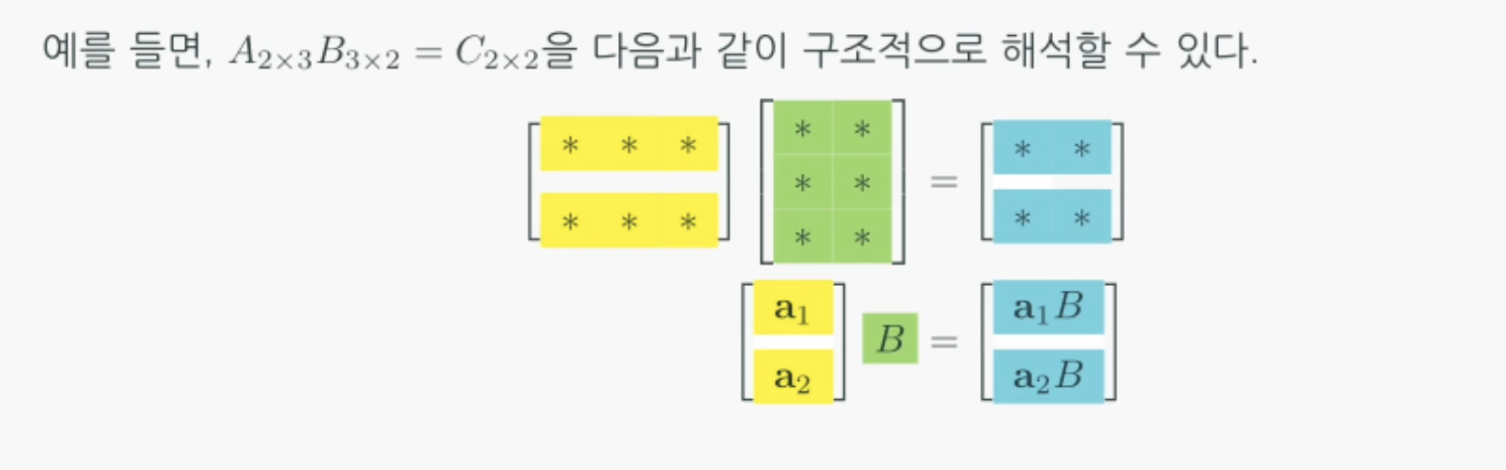 이렇게 행렬을 여러 구조로 보는 방법을 분할행렬(partition matrix) 또는 블록행렬(block matrix)이라 합니다.
