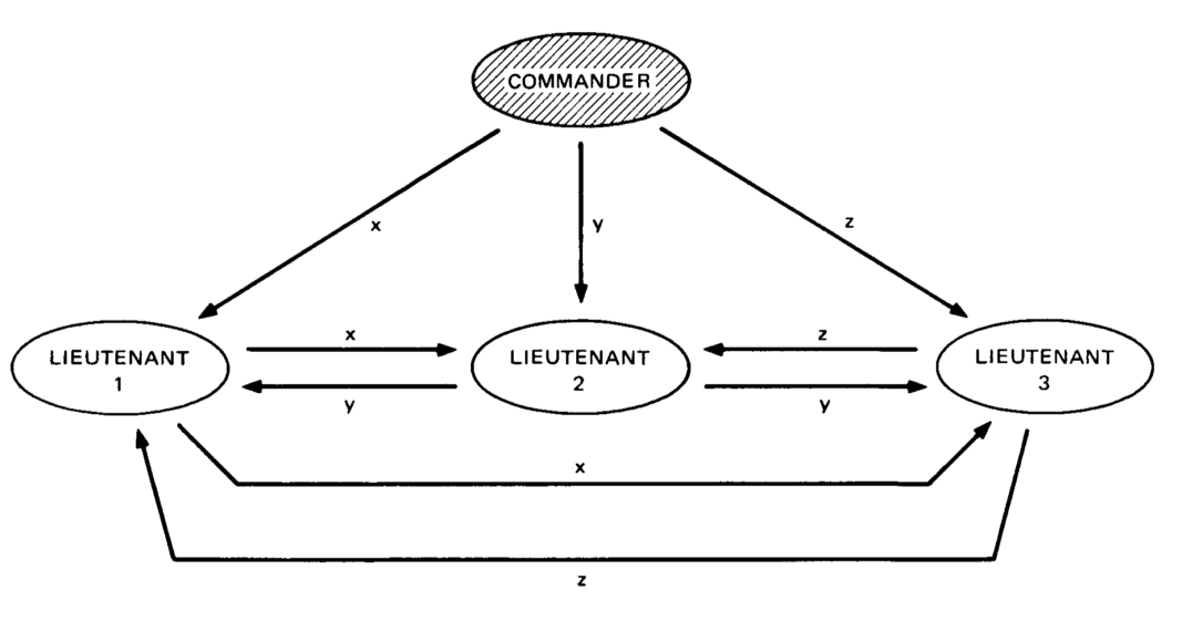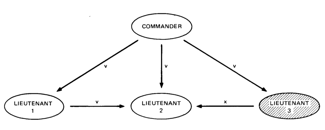 지휘관이 배신자인 경우에는 어떻게 될까요? 우선 지휘관이 x라는 명령을 하달합니다. 부관들도 x라는 명령에 대해 서로에게 전파를 하고 전체적인 시스템은 x에 대해 합의합니다. x라는 명령을 모두가 실행하더라도 전쟁에서는 문제될것이 없습니다. 공격이라면 성을 함락시키는데에 성공할 것이고 후퇴라면 모두가 살아남기 때문입니다.